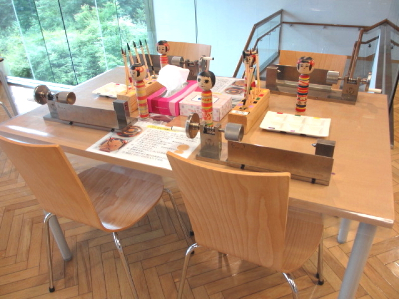 1本600円でこけしの絵付け体験ができます。 手回しロクロで土湯こけしの特徴、ロクロ線模様も描くことができます。