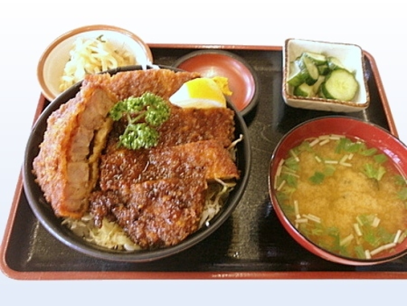 【ソースかつ丼】 <ロース¥950・ヒレ¥1,000> 味・量ともに大人気の一品!創業当時からの変わらぬ味 小食な方、女性の方のために持ち帰り用パックの ご用意もしておりますので、是非ご賞味ください! ※画像はソースかつ丼(ロース)のものです。