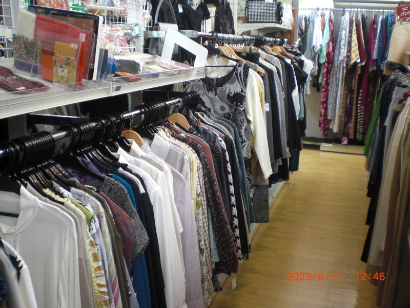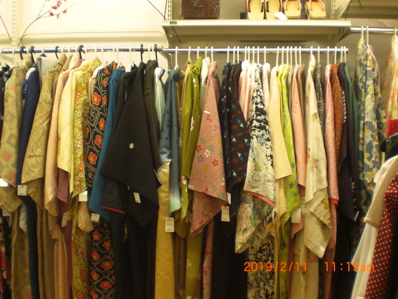 着物コーナー。主に手芸素材としての販売買取となっています。新入荷分20着ぐらい出しました。(2019/02/11)